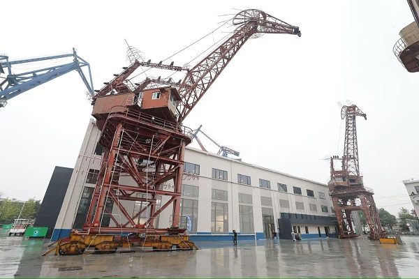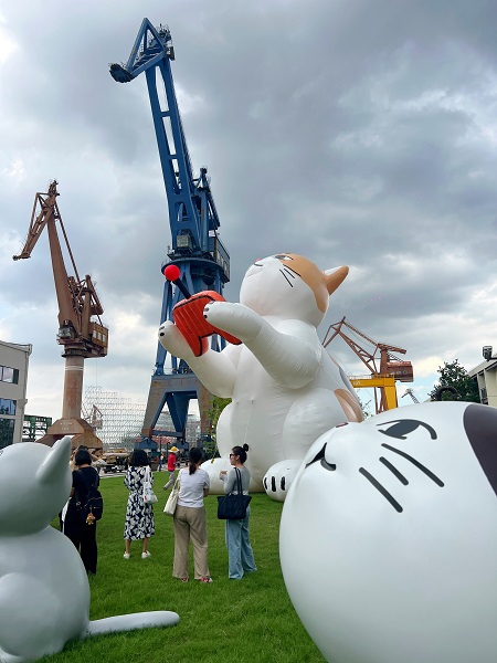 走进复兴岛船台公园,著名插画家Tango的巨型装置《猫的叠加态》率先迎接游客。“花花”大猫手持遥控器仰望林立塔吊,将当下与工业过往串联,为冷峻厂区注入柔软与轻盈。这里曾是中华造船厂旧址,如今3000平方米的船体加工车间被改造为“复兴云厅(A馆)”,成为主题展核心空间。